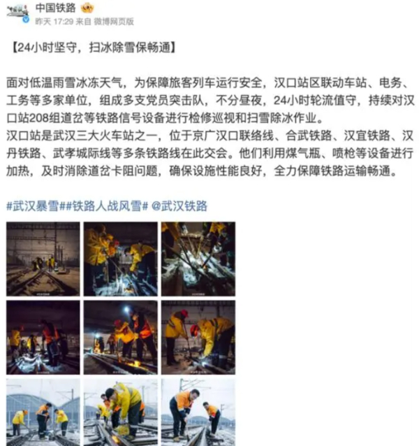 2月4日,武汉铁路局的微博发布过一份公告,解释了冰冻雨雪天气高铁大面积晚点的原因,主要包括三点:接触网覆冰导电不良、道岔结冰转换不灵活、线路积雪列车降速运行。