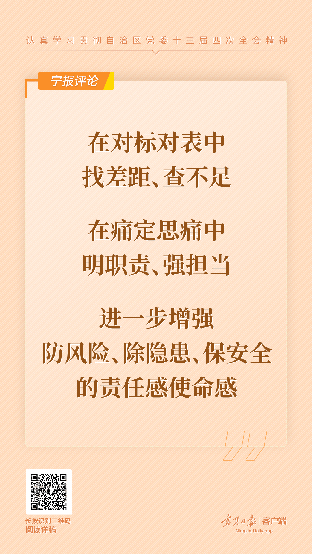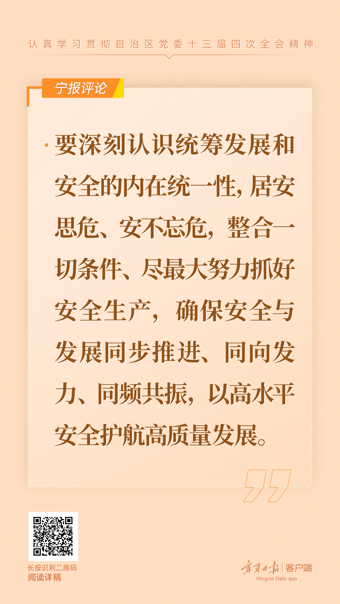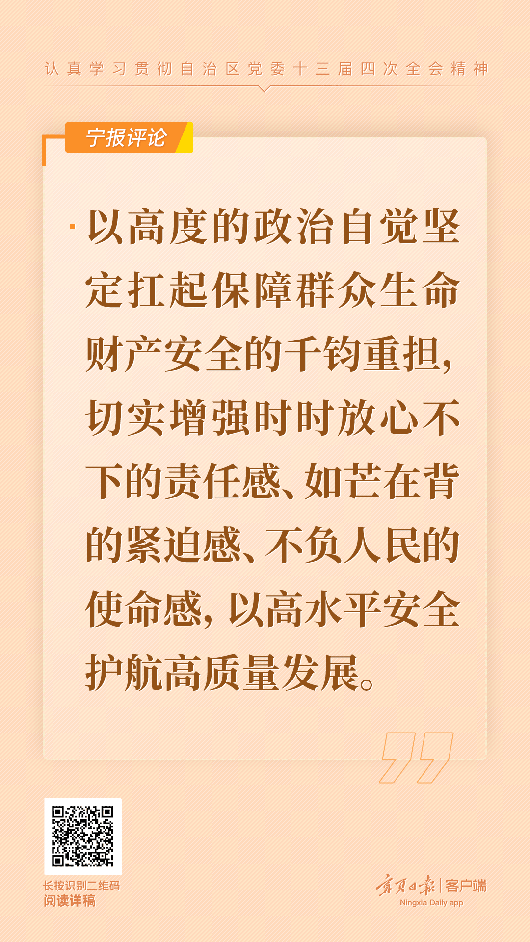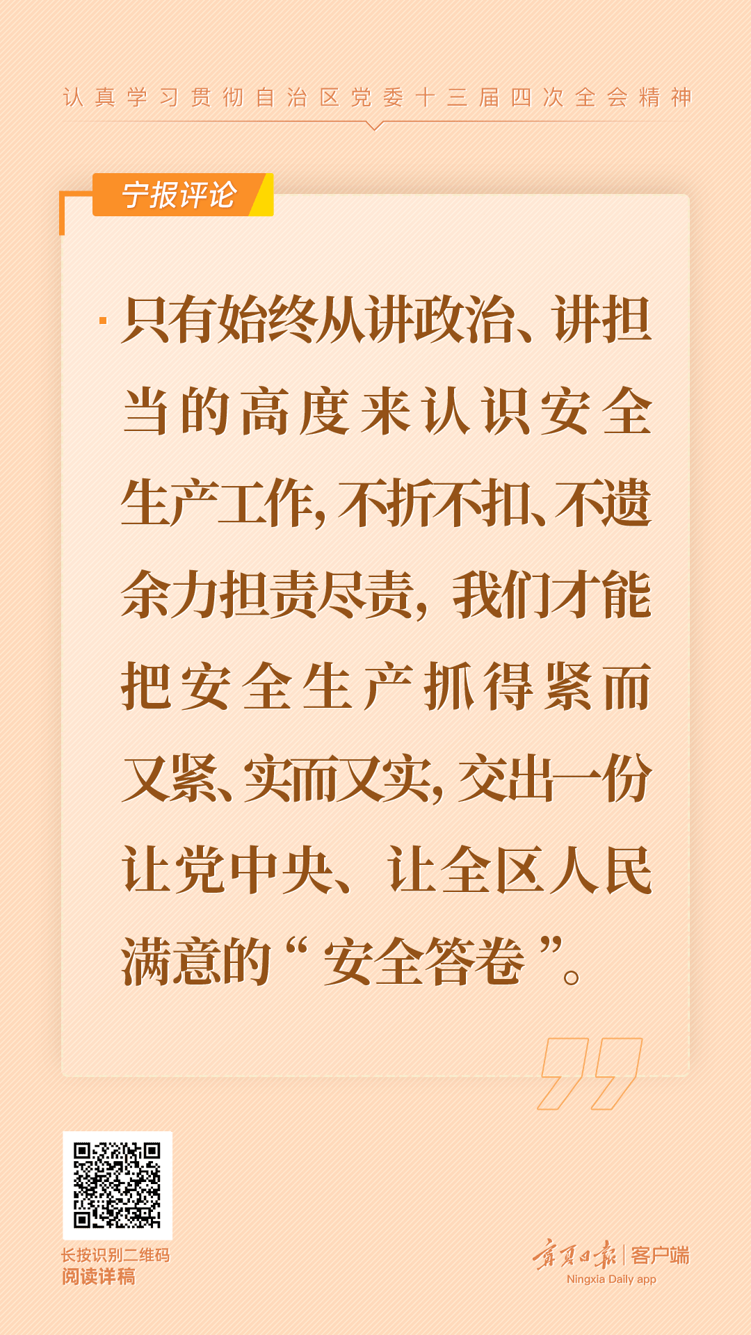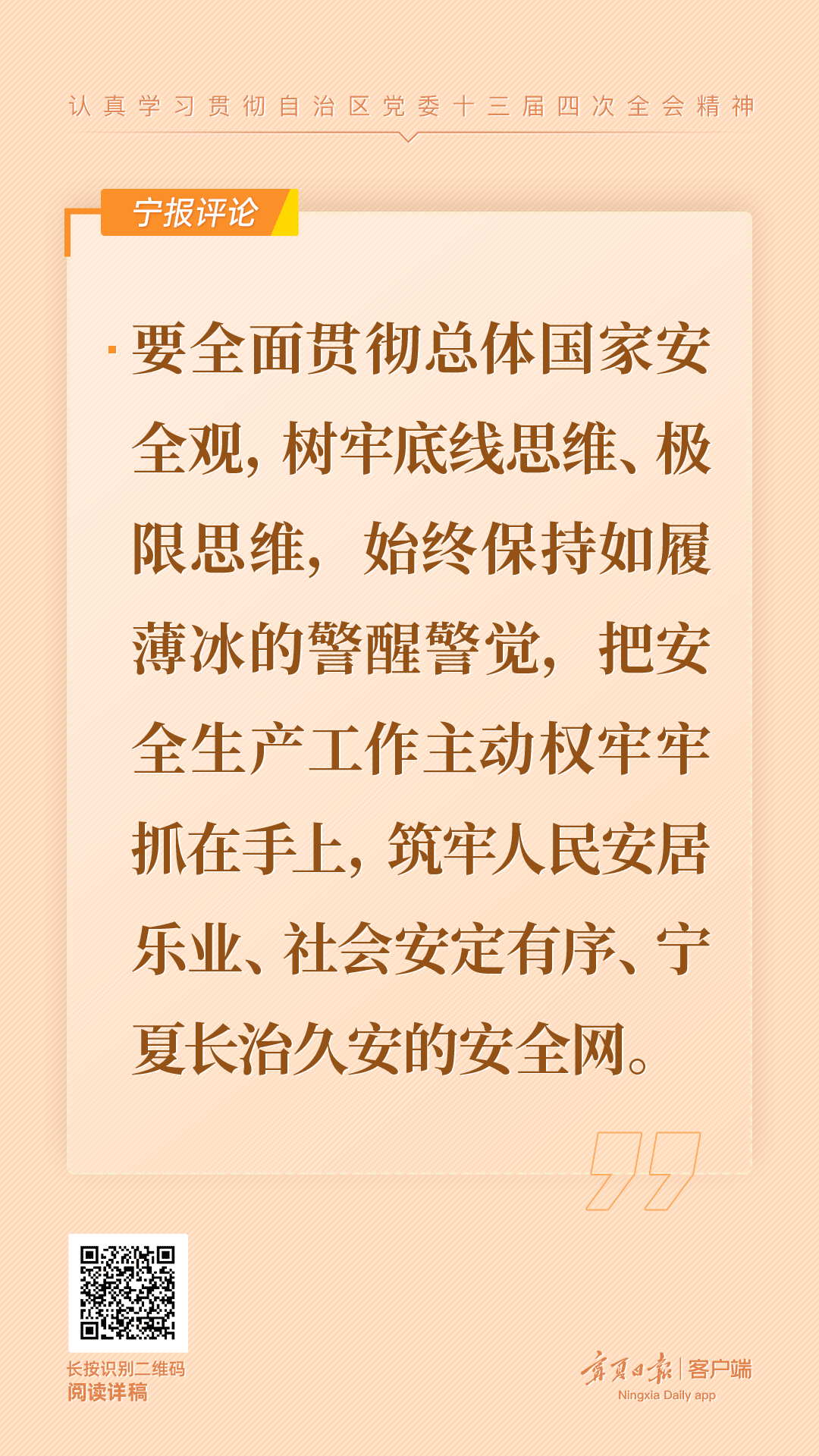 【编者按】刚刚闭幕的自治区党委十三届四次全会,聚焦安全“头等大事”,传递出守住安全生产底线,就是守住人民生命线的深刻意蕴,宁夏日报推出系列评论员文章,对此进行深刻论述。从今天起,我们将梳理系列评论中的金句,和大家共同学习,赶紧收藏吧!