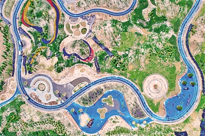 8月2日,从空中俯视,今年新建的银川市兴庆区丽景北街小微公园已基本建成,蓝色的健身步道犹如一条丝带蜿蜒环绕在小微公园的绿地之间,成为周边居民休闲运动的又一好去处。今年,银川市园林管理局投资3800余万元,高水准如期建成了6个小微公园,总面积达到24.7公顷。记者 马楠 摄