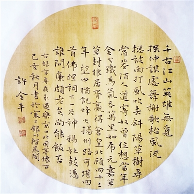 许金平女,祖籍山东济南,研究生学历,中共党员,银川市青联委员,现为银川书画院专职书画家。系中华诗词学会会员,宁夏诗词协会副秘书长、宁夏书法家协会会员、宁夏青年书法家协会理事、宁夏美术家协会会员、银川市书协常务理事、宁夏妇女书法家协会理事、银川市美术家协会副秘书长。结业于中国西部书法新秀楷书班。作品入展全国第二届行书作品展、全国首届“汝帖杯”书法大赛、全国首届“河间府杯”书画大赛等。被宁夏书法家协会和银川市书法家协会评为2018年度“优秀书法家”和“杰出书法家”。