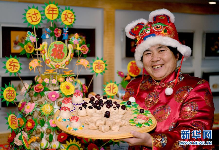 陕西“关中花馍”传承人党亚贤在展示自己制作的花馍(1月10日摄)。 1月10日,陕西省西安市碑林区文化馆开展年俗体验活动,邀请非遗传承人向小朋友们介绍关中花馍的历史传承、制作技艺,让孩子们在春节来临之际了解中国传统文化,感受浓浓年味。 新华社记者 刘潇 摄