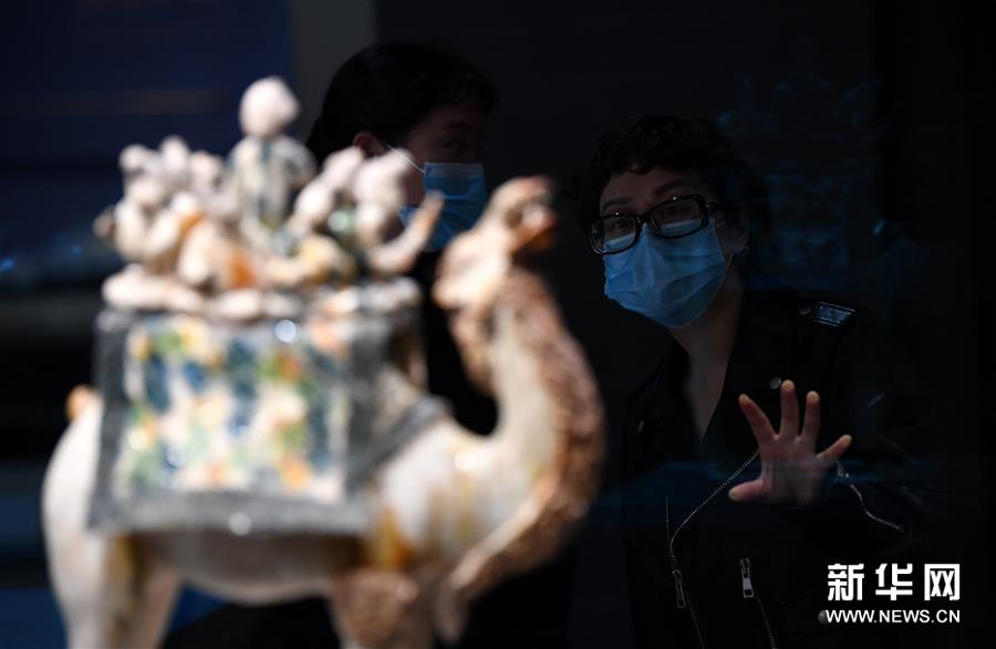 游客在陕西历史博物馆参观唐三彩骆驼载乐俑(3月25日摄)。 新华社记者 李一博 摄